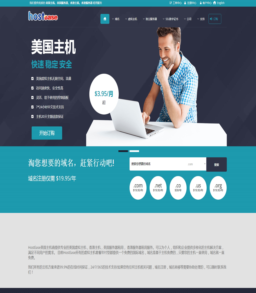 HostEase是一家知名的美国主机商,是最早开拓国内市场的美国主机商之一。HostEase最初提供美国虚拟主机/香港虚拟主机和香港服务器租用等主机业务,发展至今已经与美国、香港等地的多个知名机房直接合作,面向全球用户提供等多机房、多类型主机产品。HostEase对中国用户先后推出中文官网和中文客服,支持支付宝付款等本土化服务。HostEase主机在中国地区访问速度快,性能稳定,一直以来深受国内中小企业和个人用户的欢迎。